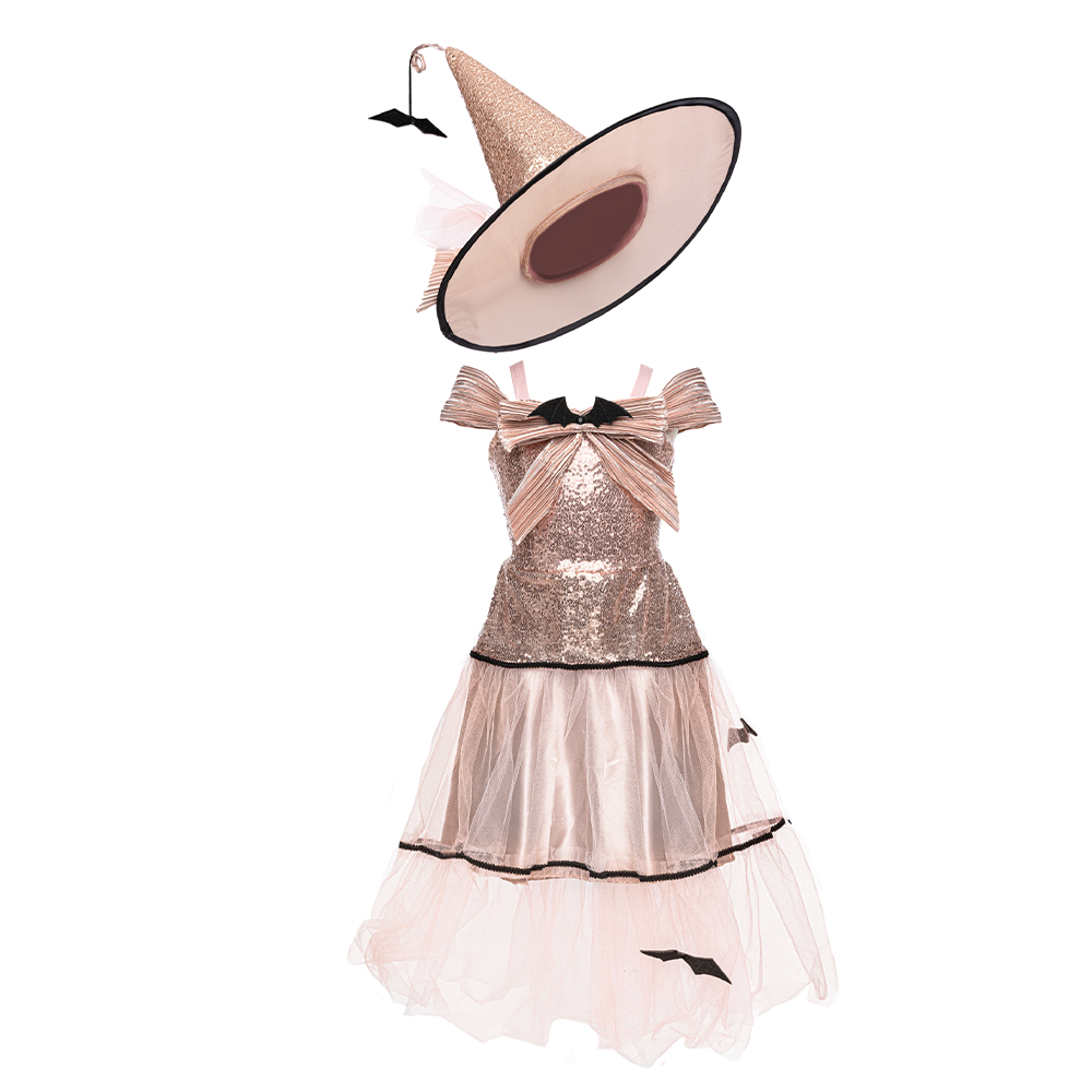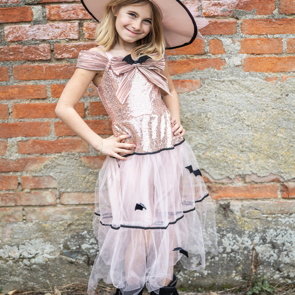 Στολή μάγισσας σε ροζ-χρυσό χρώμα το μπούστο έχει λαμπερές παγιέτες και βελούδινο φιόγκο,η φούστα είναι από τούλι και έχει πάνω νυχτερίδες.